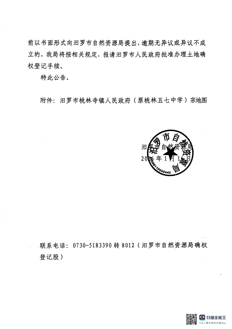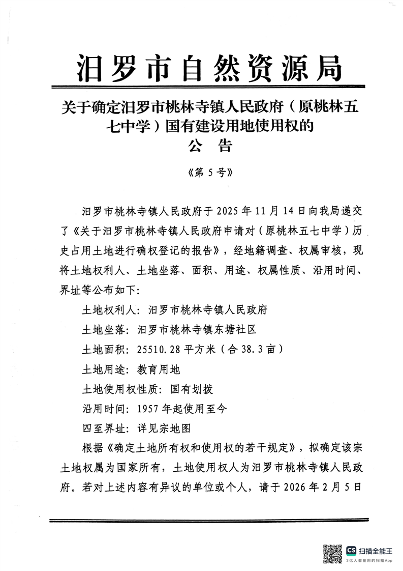关于确定汨罗市桃林寺镇人民政府(原桃林五七中学)国有建设用地使用权的公告