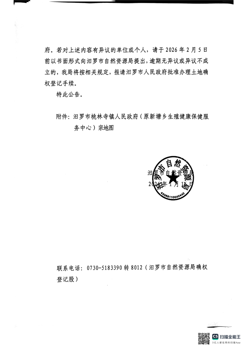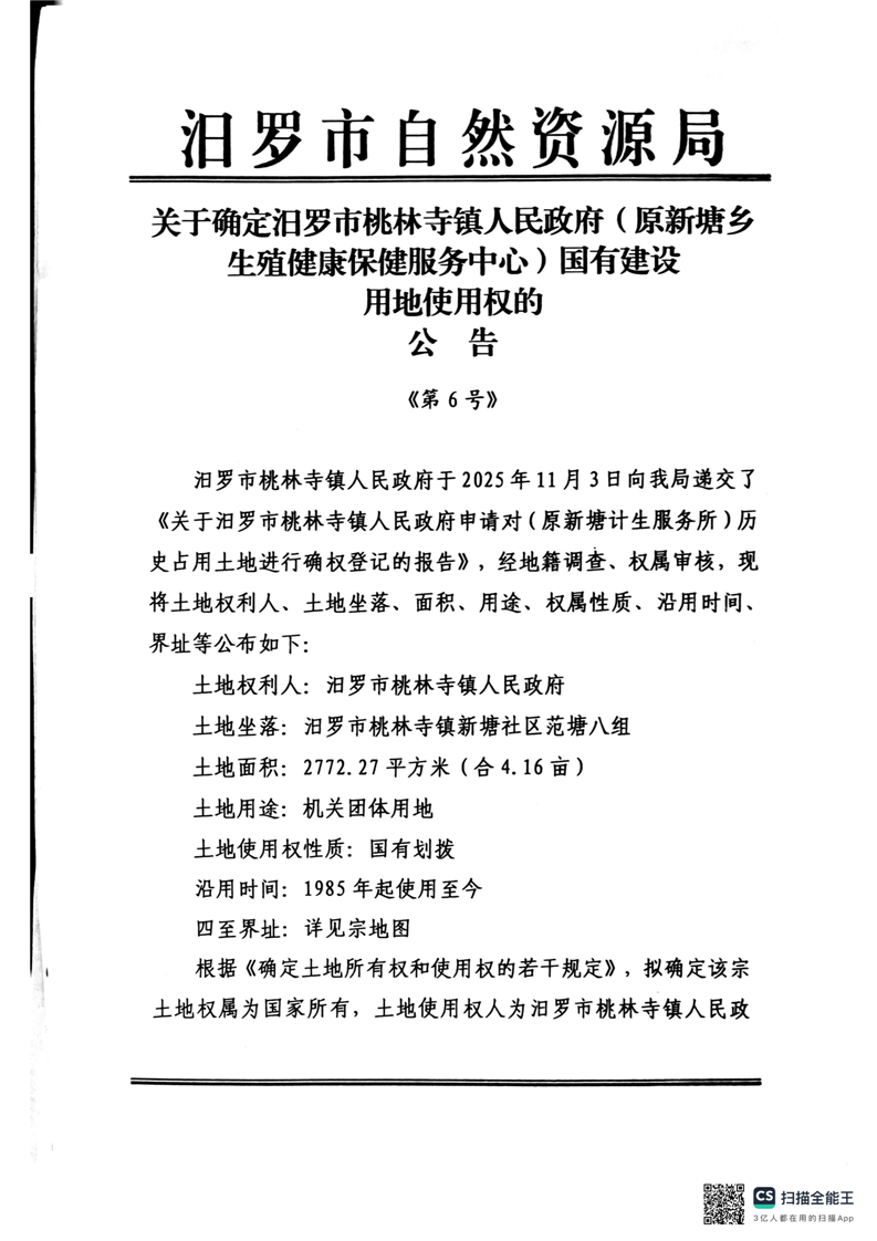 关于确定汨罗市桃林寺镇人民政府(原新塘乡生殖健康保健服务中心)国有建设用地使用权的公告