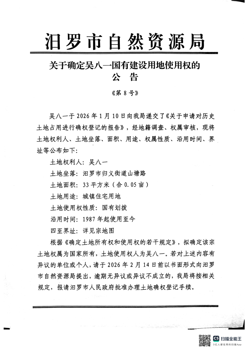 关于确定吴八一国有建设用地使用权的公告