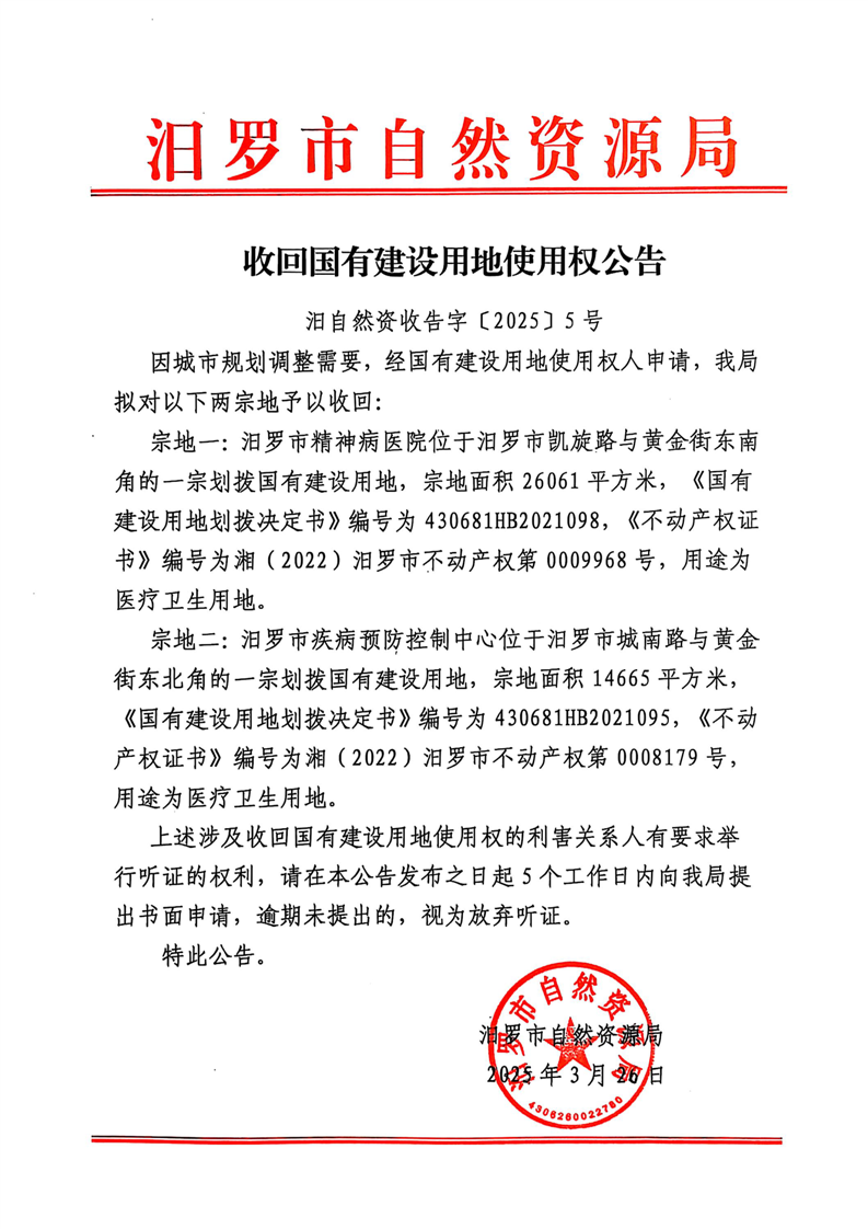 收回国有建设用地使用权公告 汩自然资收告字[2025]5号
