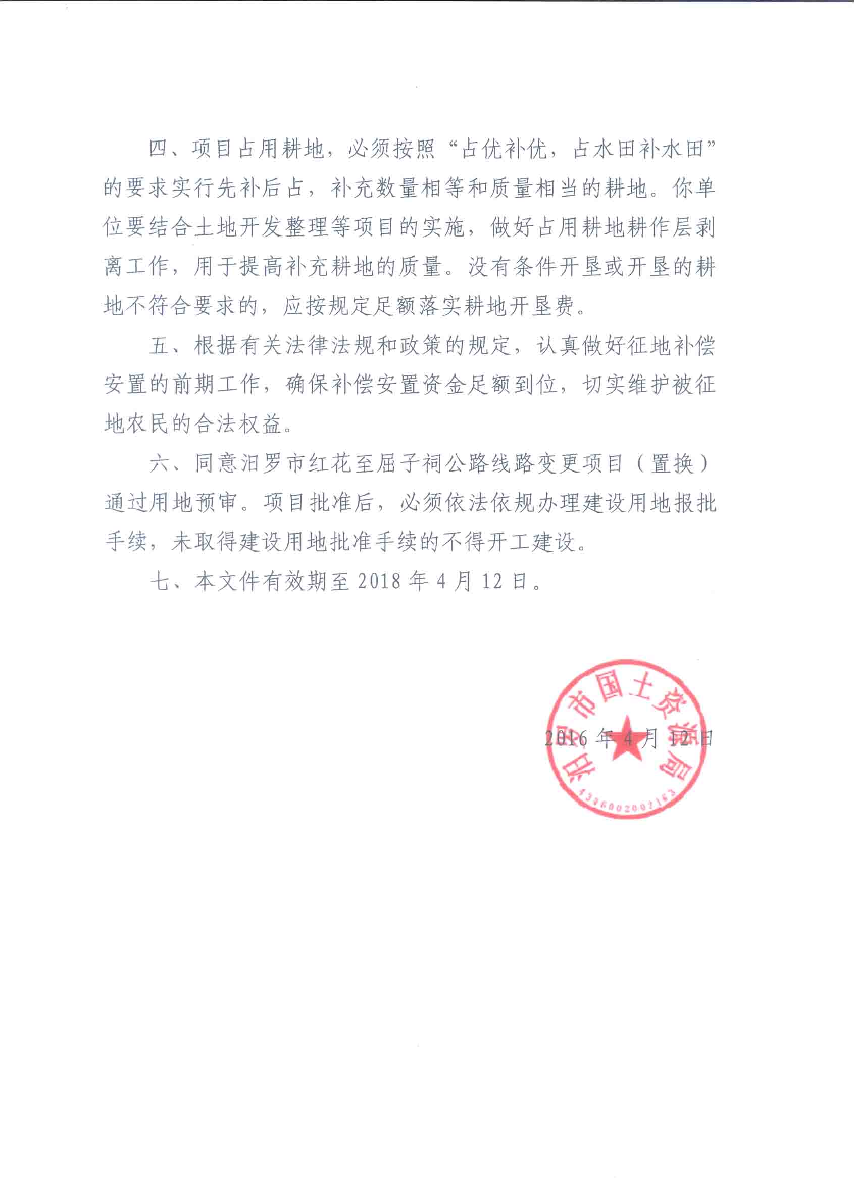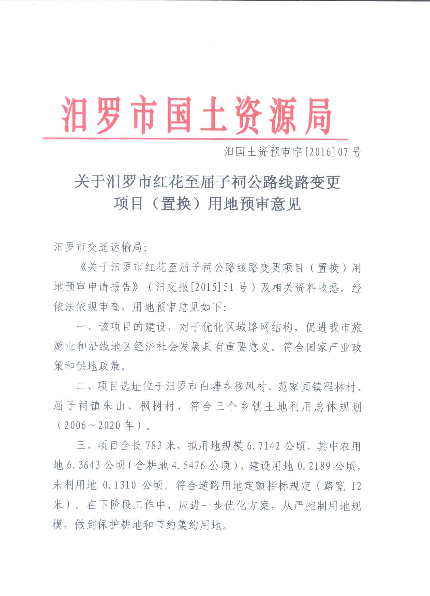 关于汨罗市红花至屈子祠公路线变更项目(置换)用地预审意见