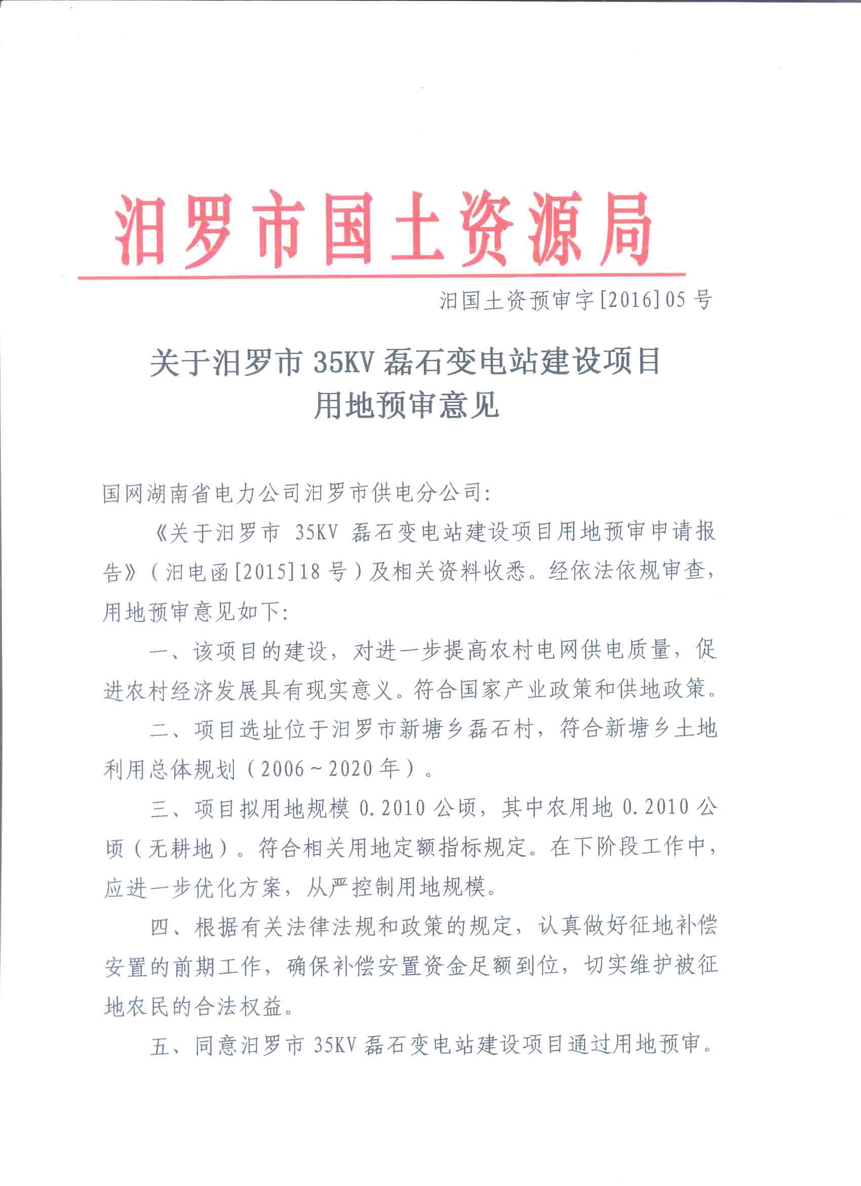 关于汨罗市35KV磊石变电站建设项目用地预审意见