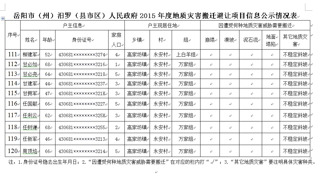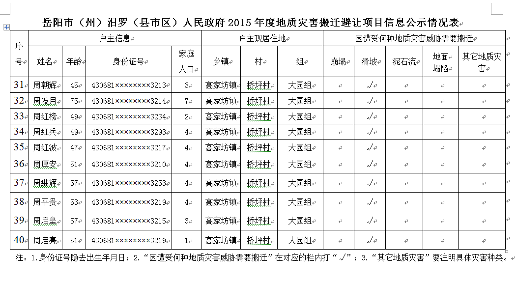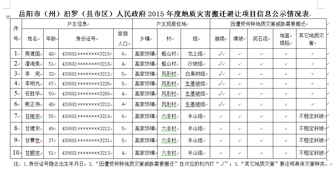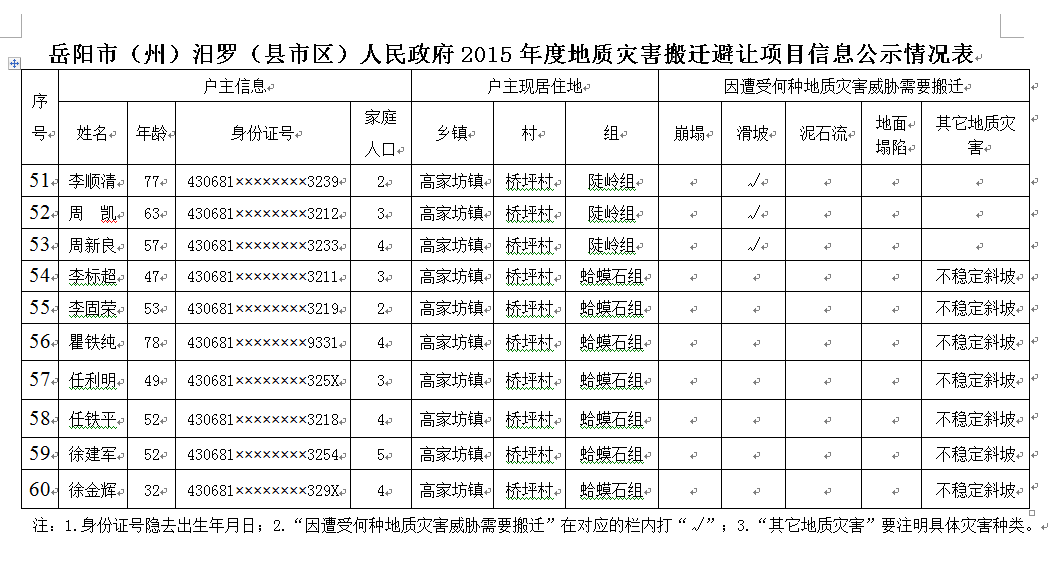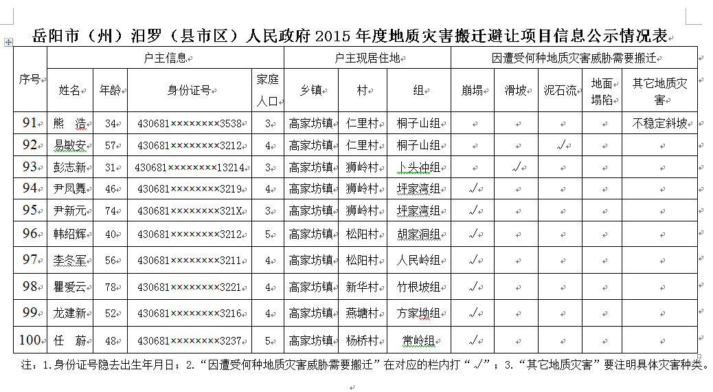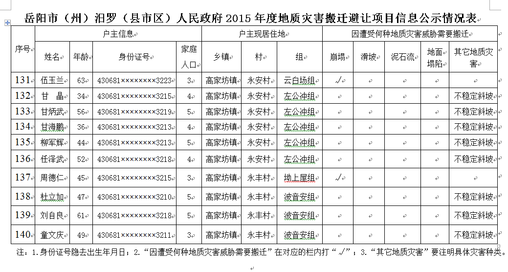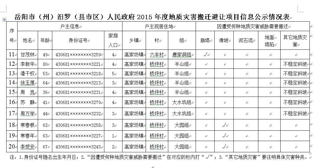 2015年度地质灾害搬迁避让项目坚持“公开、公平、公正”的原则,接受公众监督。公示期间如有异议,请实名向 汨罗市国土资源局投诉。