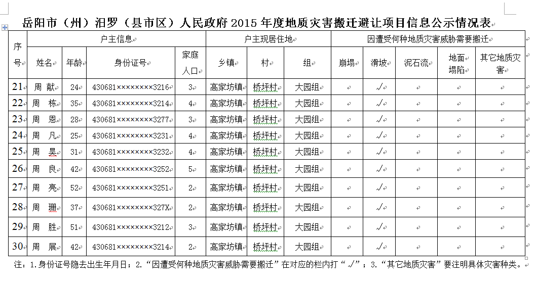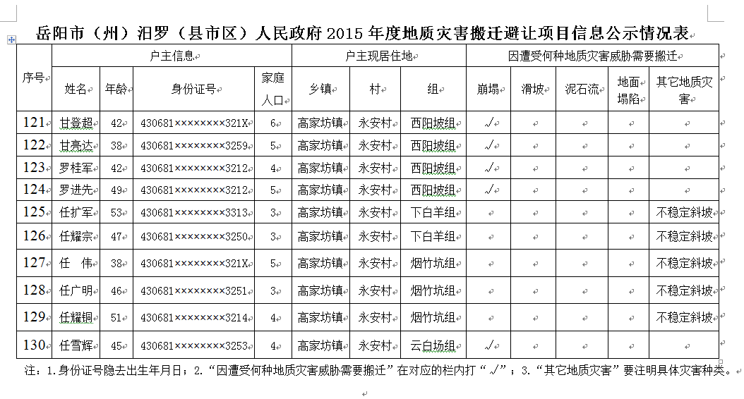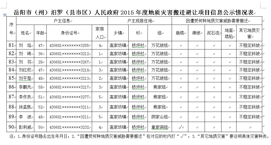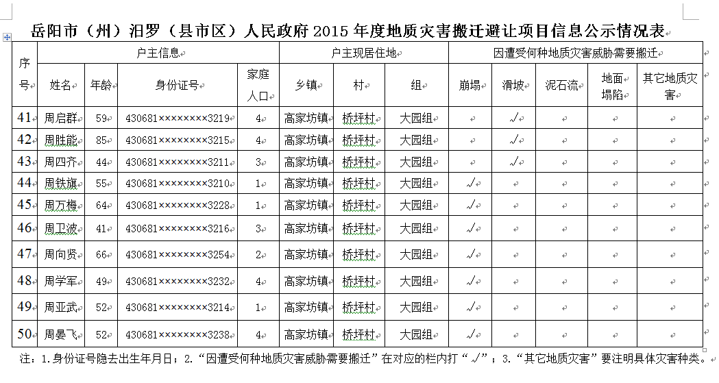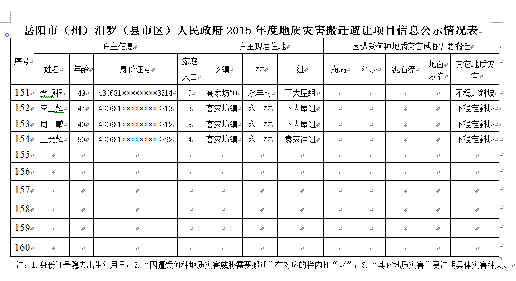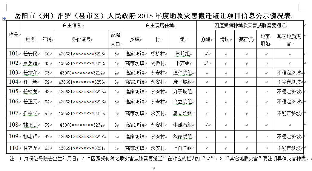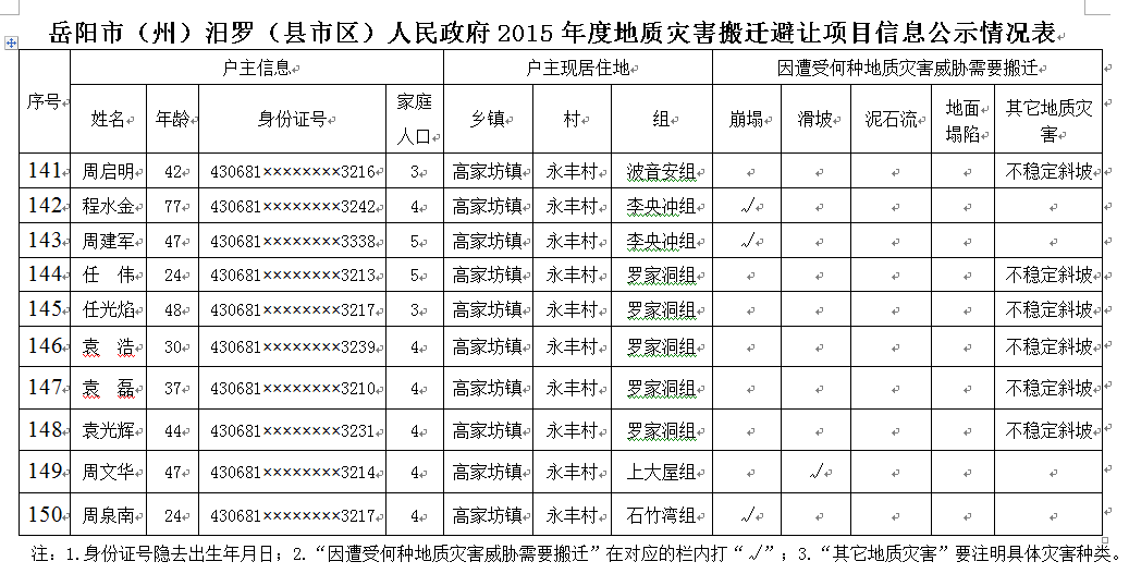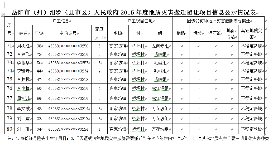 2015年度地质灾害搬迁避让项目坚持“公开、公平、公正”的原则,接受公众监督。公示期间如有异议,请实名向 汨罗市国土资源局投诉。