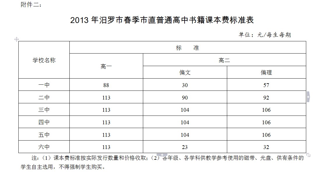 附件二:2013年汨罗市春季市直普通高中书籍课本费标准表
