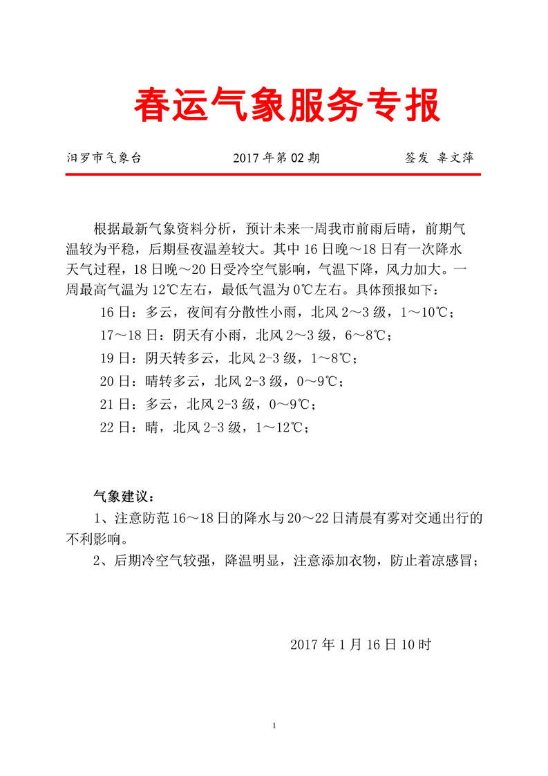 汨罗市春运气象服务专报2017年第2期