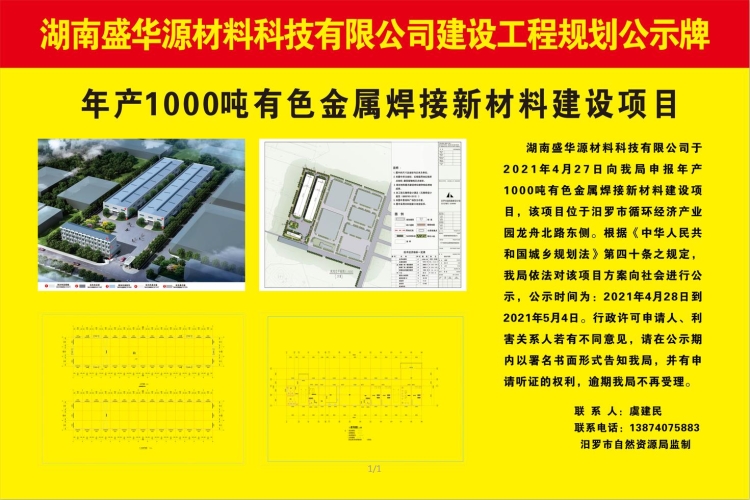 湖南盛华源材料科技有限公司年产1000吨有色金属焊接新材料建设项目工程规划公示