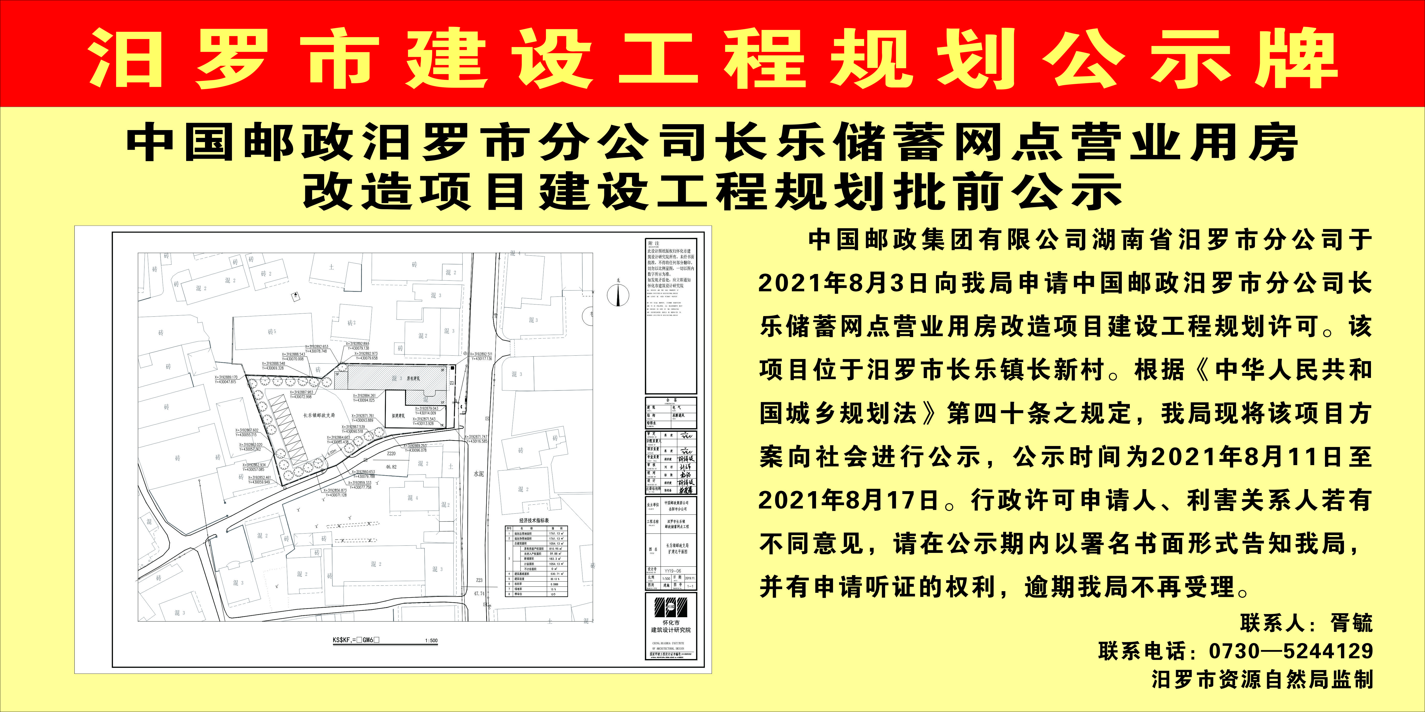 中国邮政汨罗市分公司长乐储蓄网点营业用房改造项目建设工程规划批前公示