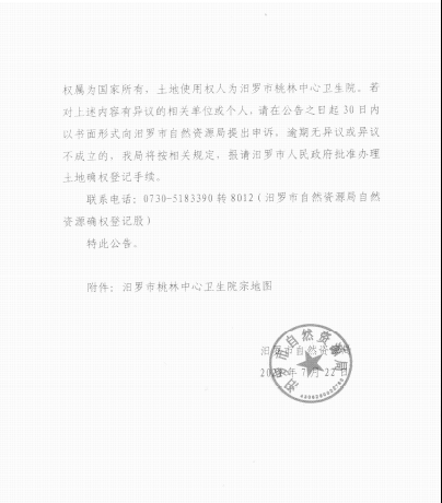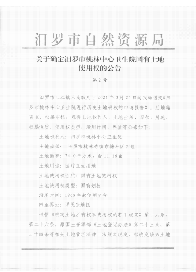 关于确定桃林寺镇桃林中心卫生院国有土地使用权的公告