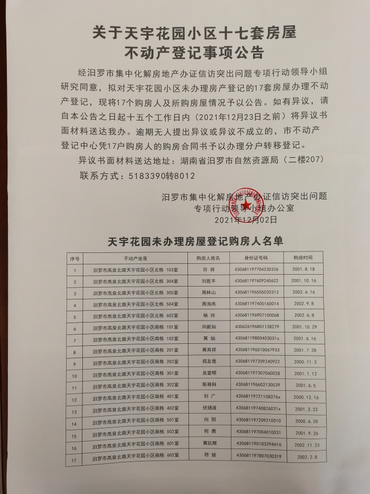 关于天宇花园小区十七套房屋不动产登记事项公告