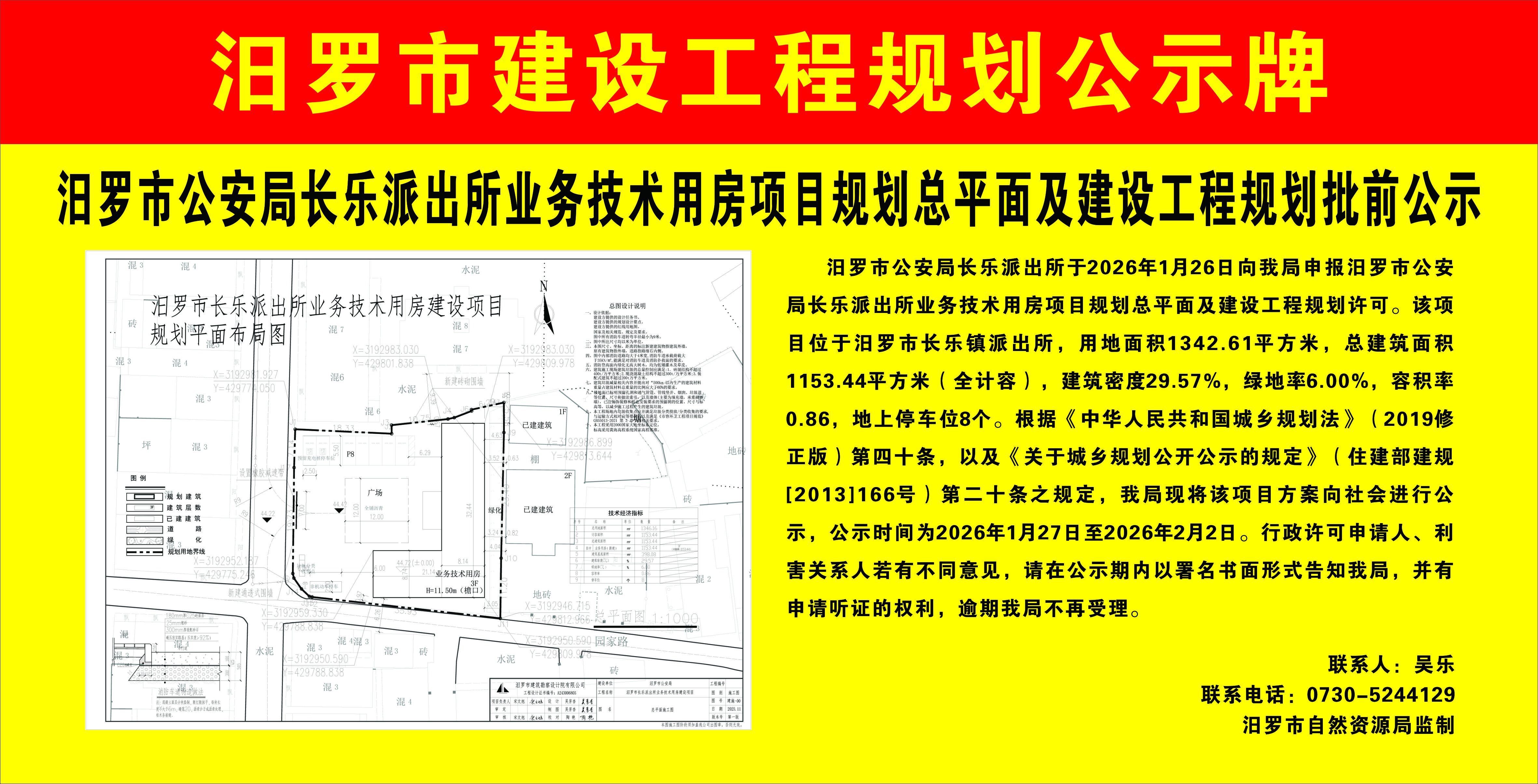 汨罗市公安局长乐派出所业务技术用房项目规划总平面及建设工程规划批前公示