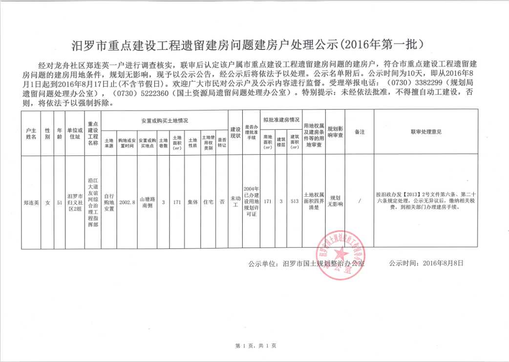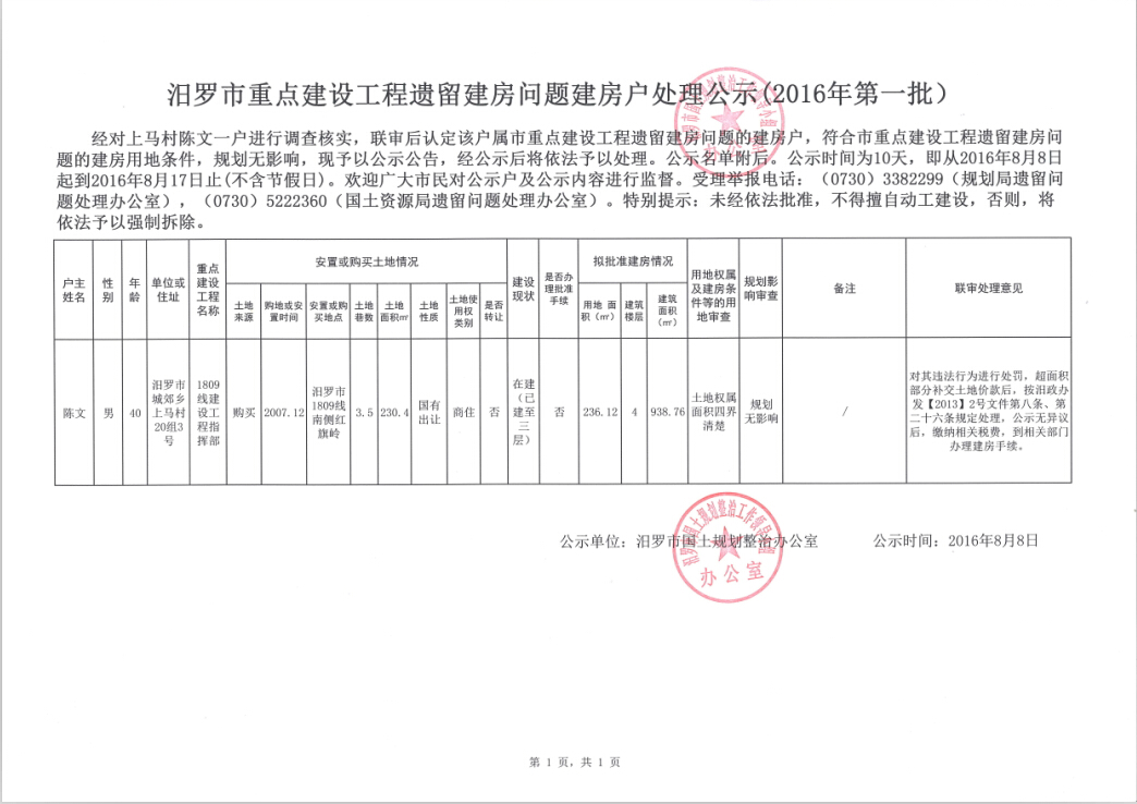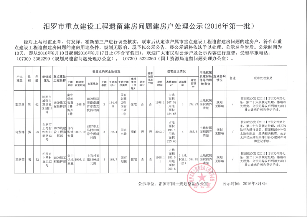 汨罗市重点建设工程遗留建房问题建房户处理公示(第一批A)