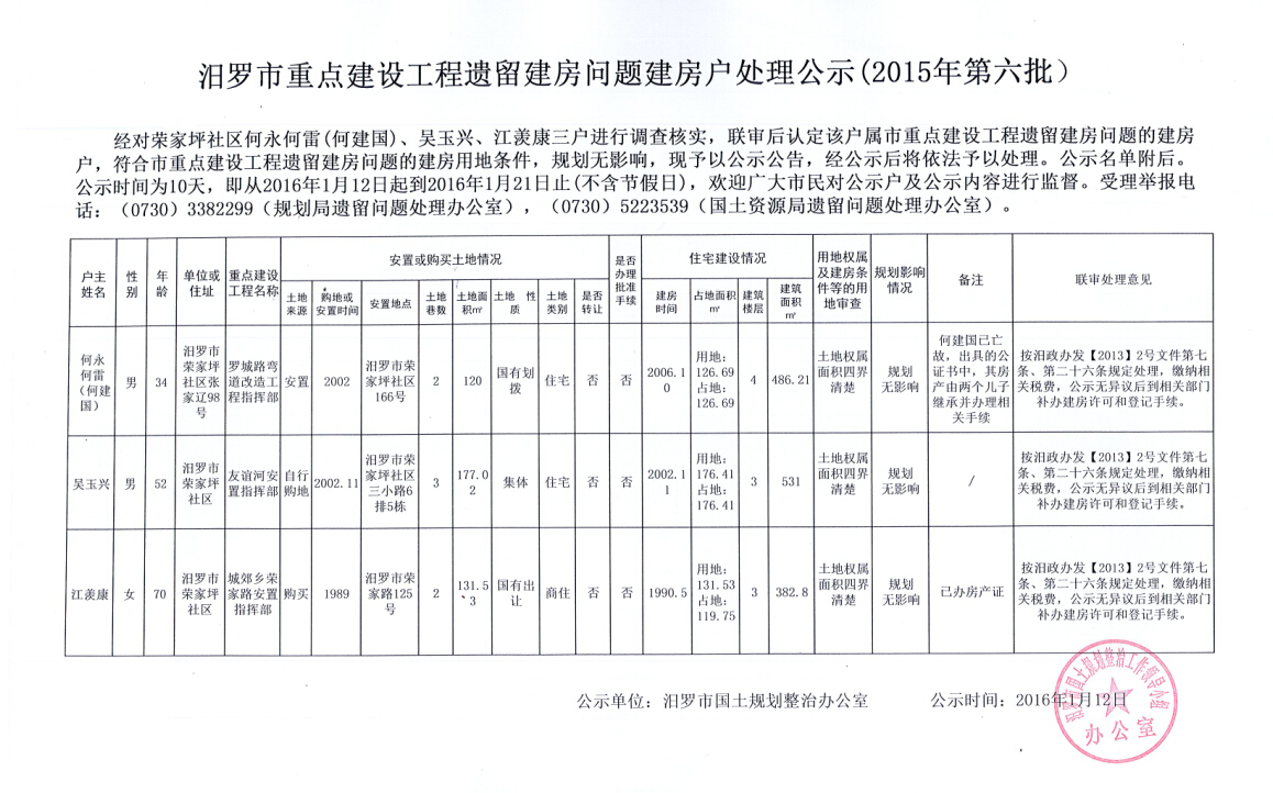 汨罗市重点建设工程遗留建房问题建房户处理公示(2015第六批6)