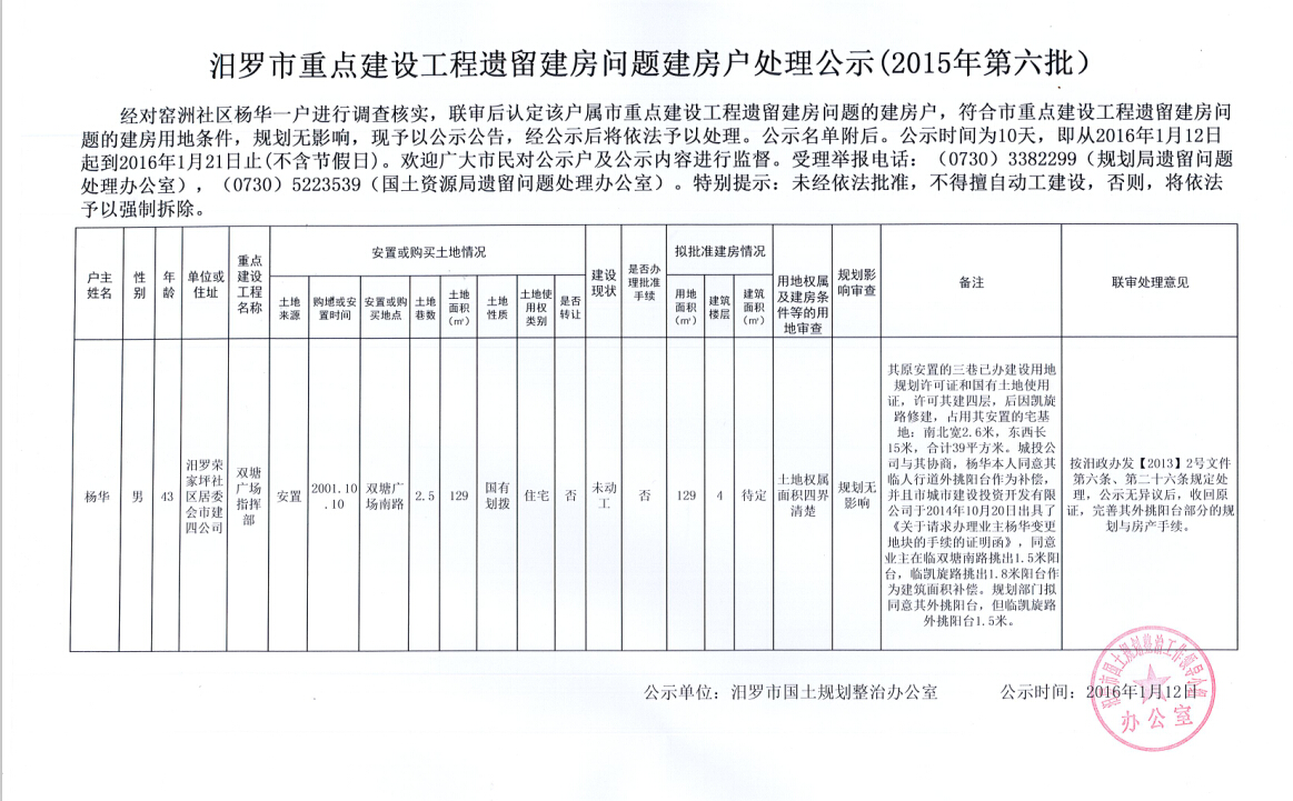 汨罗市重点建设工程遗留建房问题建房户处理公示(2015第六批)