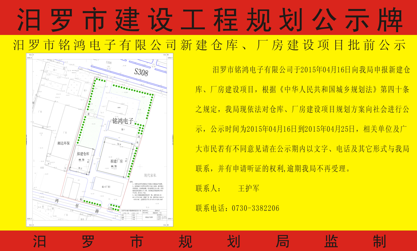 汨罗市铭鸿电子有限公司新建仓库、厂房建设项目批前公示