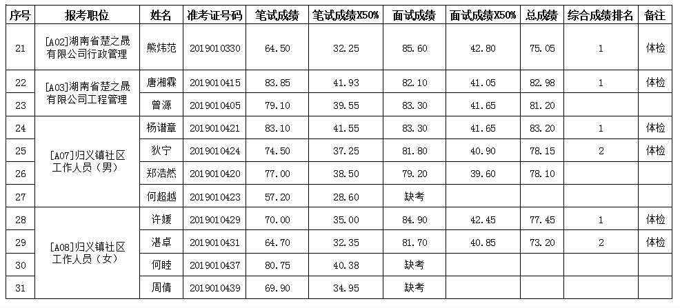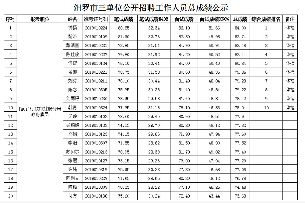 面试成绩 ‖ 汨罗市三单位公开招聘工作人员入围面试人员总成绩公示及体检通知
