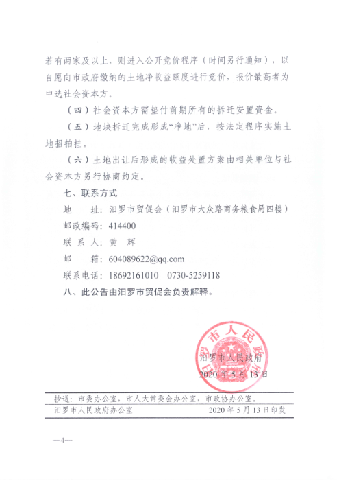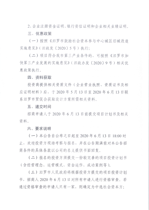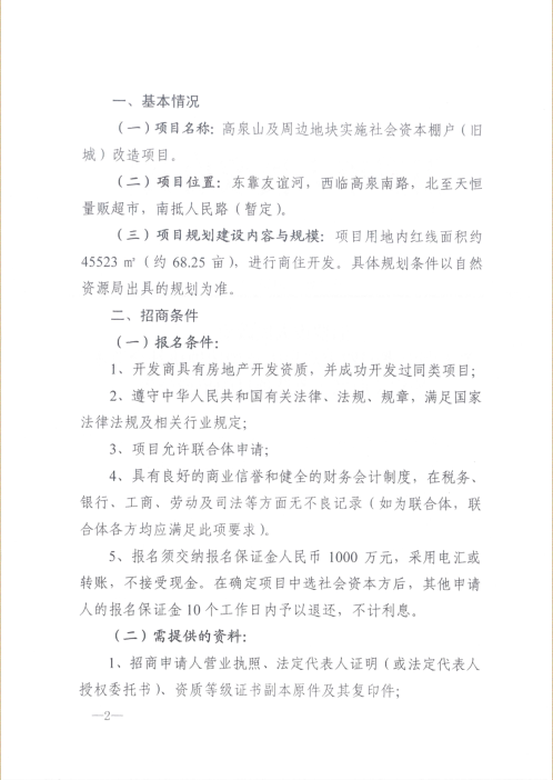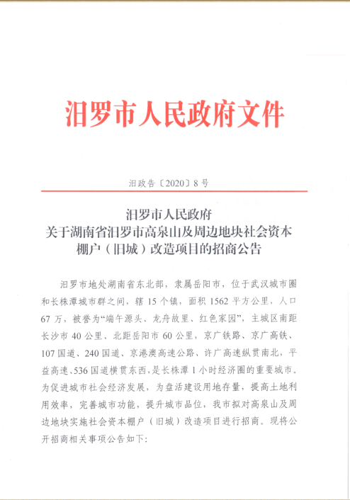 汨罗市人民政府 关于湖南省汨罗市高泉山及周边地块社会资本棚户(旧城)改造项目的招商公告