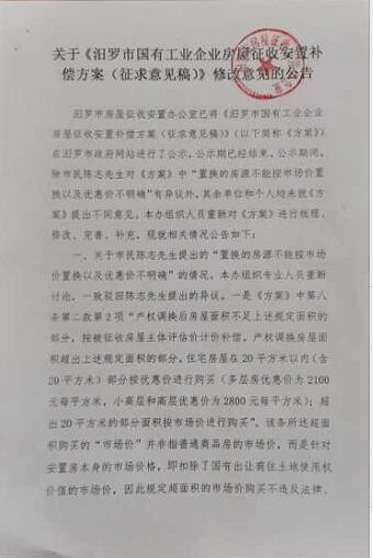 关于《汨罗市国有工业企业房屋征收安置补偿方案(征求意见稿)》修改意见的公告