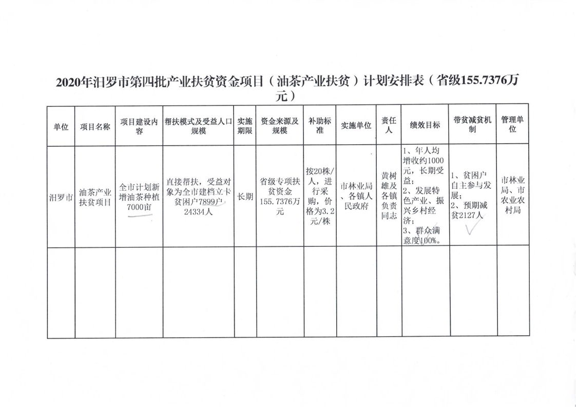 关于下达2020年汨罗市第四批产业扶贫资金项目(油茶产业扶贫项目)计划的通知