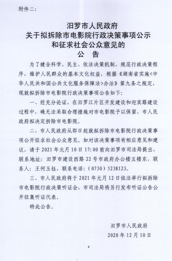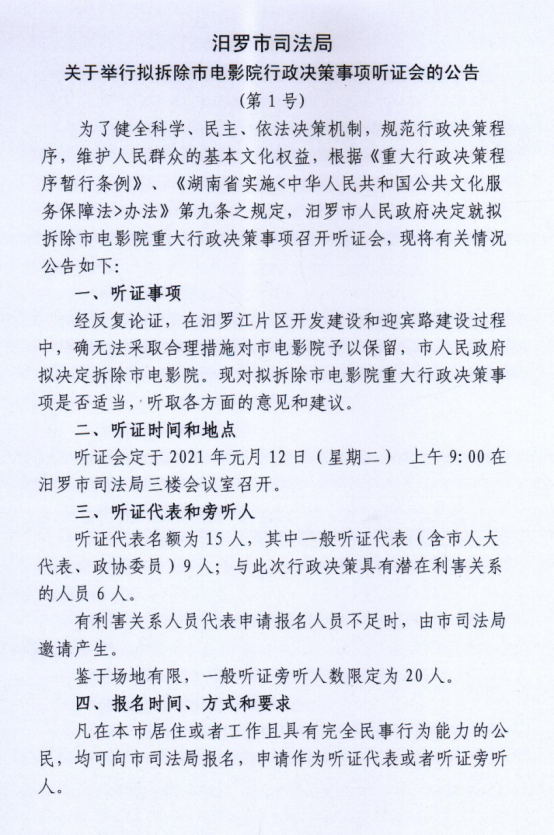 关于举行拟拆除市电影院行政决策事项听证会的公告