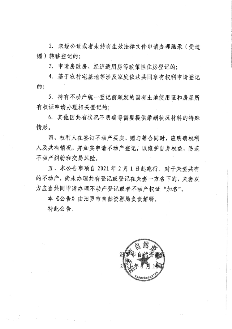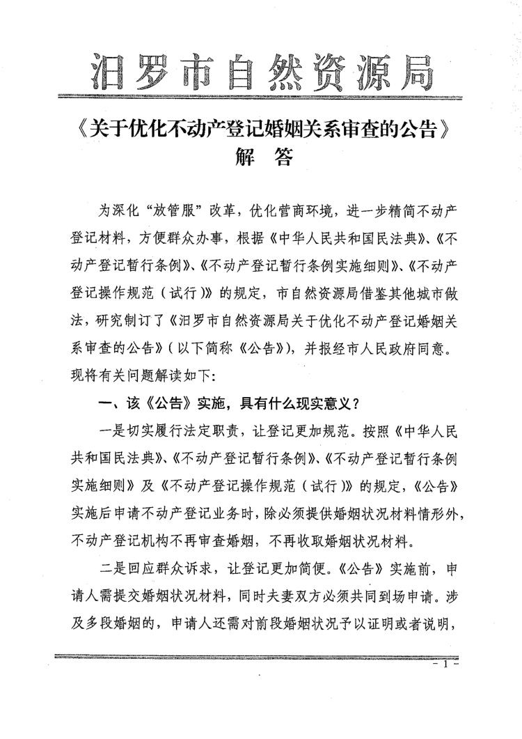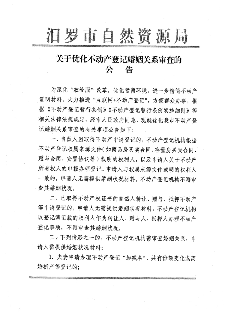 汨罗市自然资源局关于优化不动产登记婚姻关系审查的公告