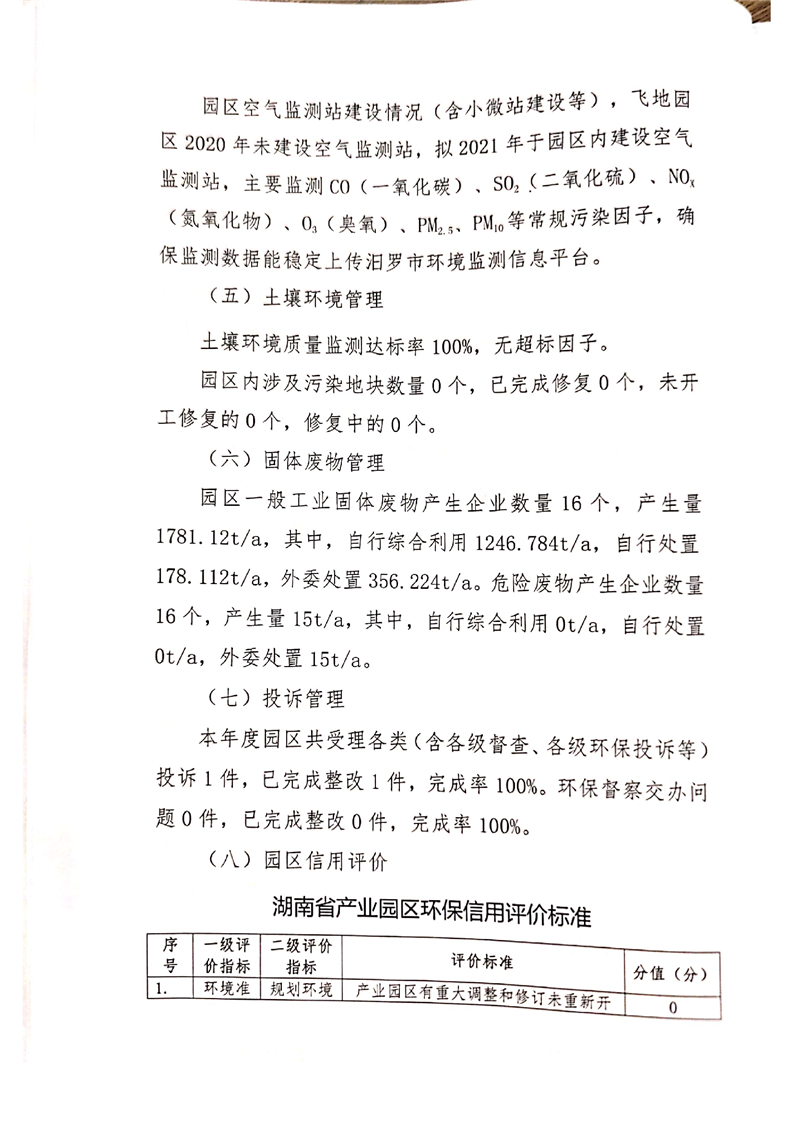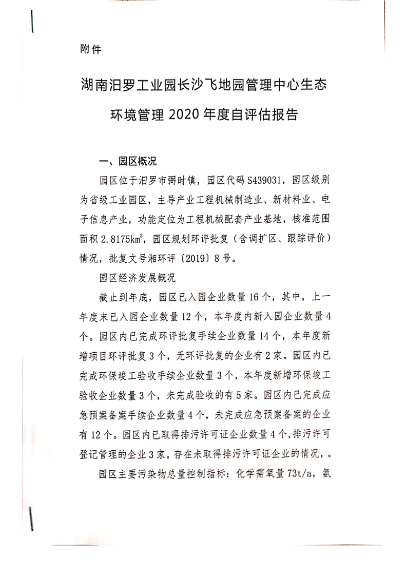 湖南汨罗工业园长沙飞地园管理中心生态环境管理2020年度自评估报告