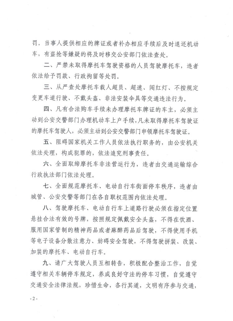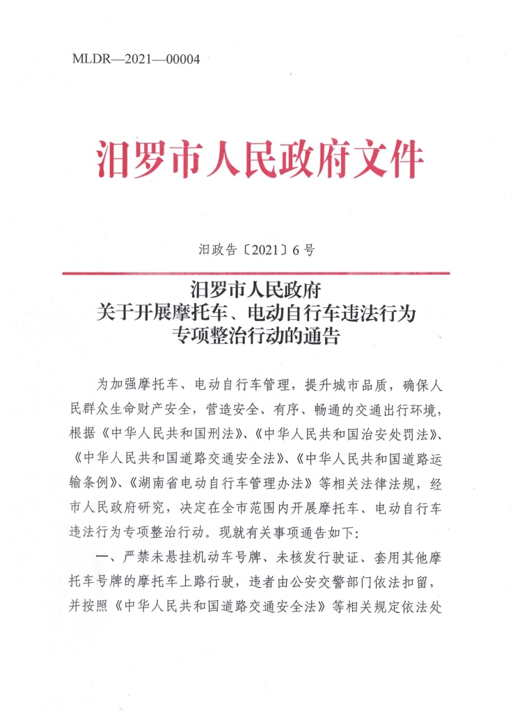 汨罗市人民政府关于开展摩托车、电动自行车违法行为专项整治行动的通告