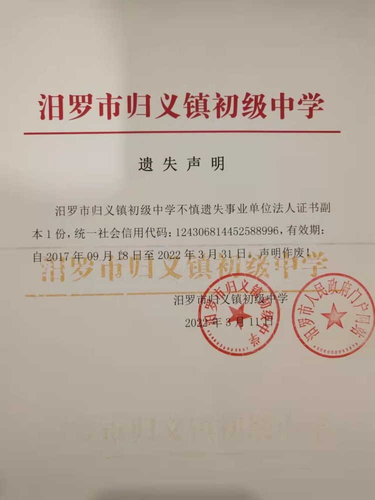 汨罗市归义镇初级中学事业单位法人证书副本遗失声明