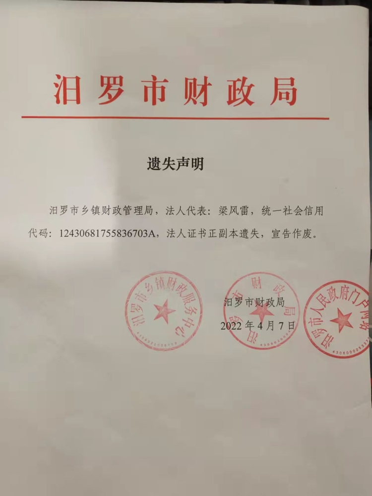 关于汨罗市乡镇财政管理局法人证书遗失声明