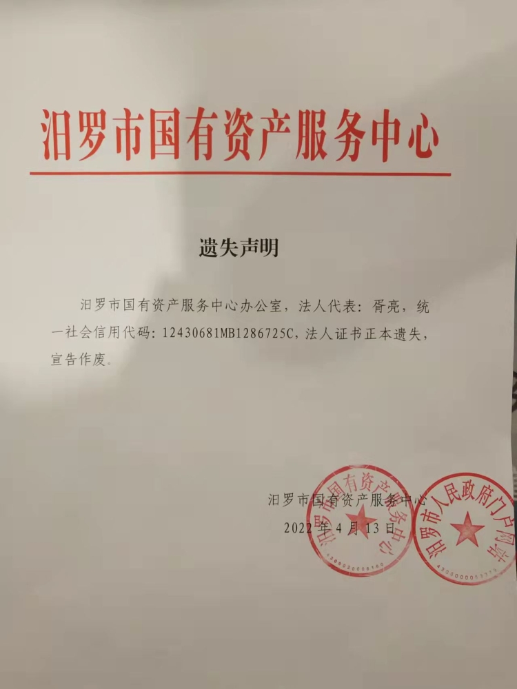 关于汨罗市国有资产服务中心法人证书遗失声明