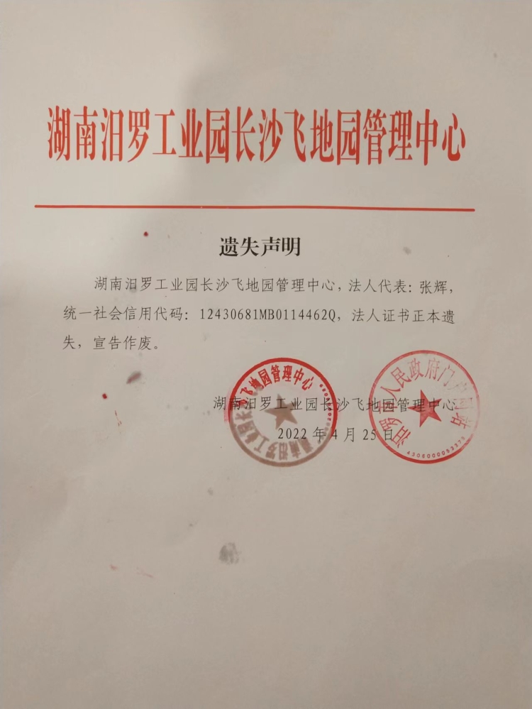 湖南汨罗工业园长沙飞地园管理中心法人证书遗失声明