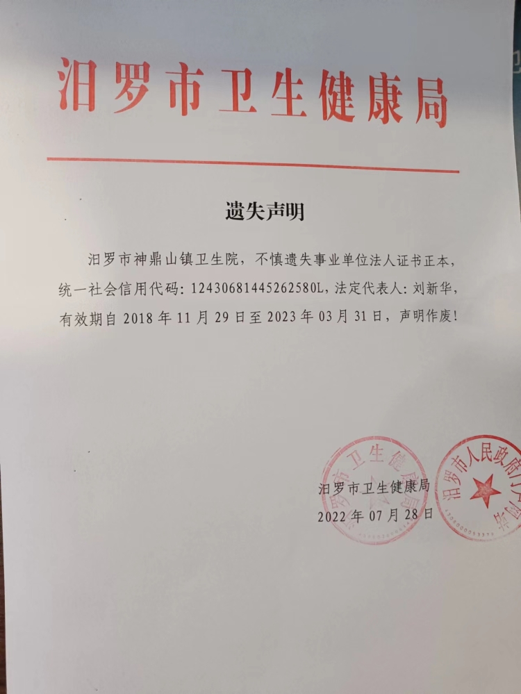 关于汨罗市神鼎山镇卫生院法人证书的遗失声明