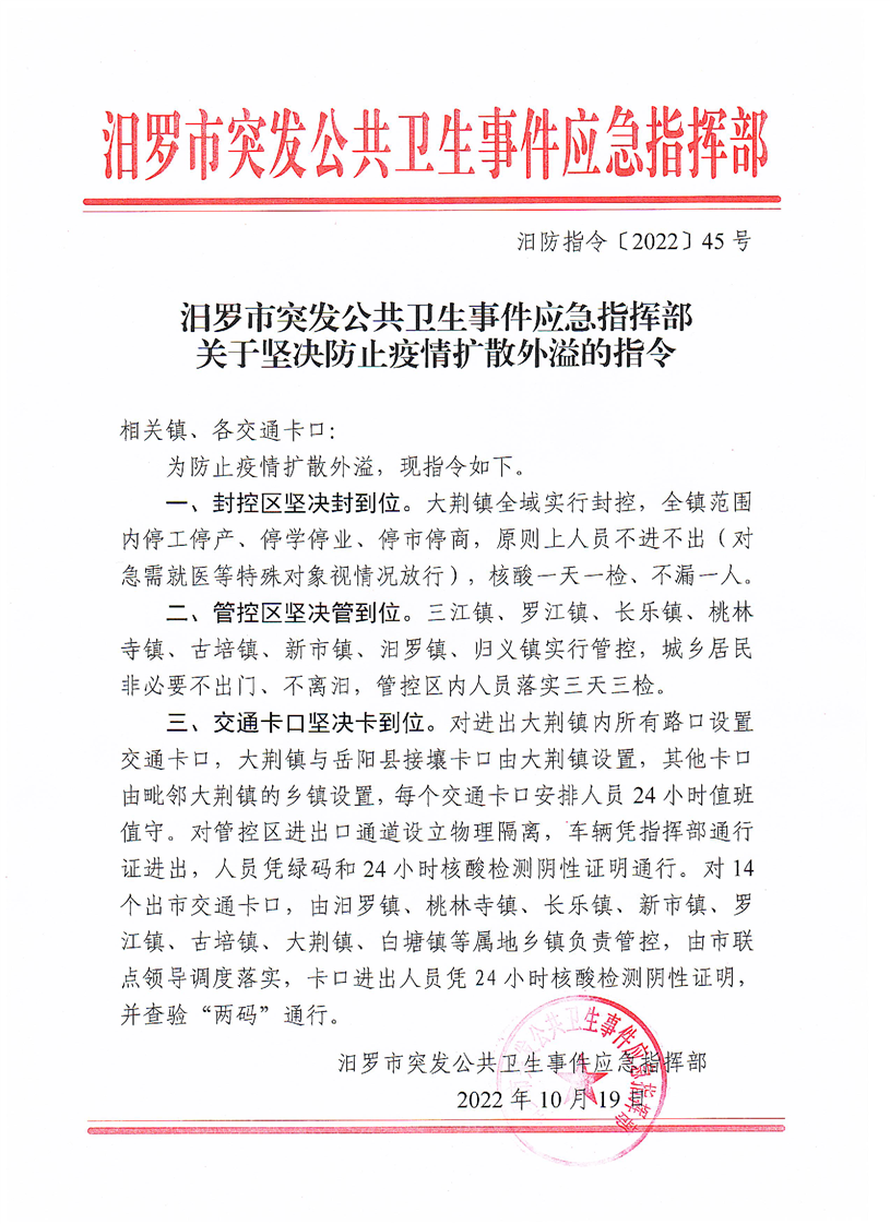 汨防指令〔2022〕45号(关于坚决防止疫情扩散外溢的指令)