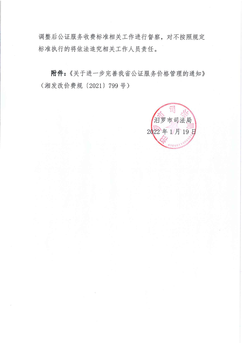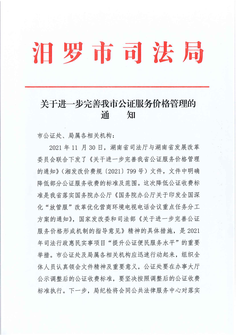 汨罗市司法局关于进一步完善我市公证服务价格管理的通知