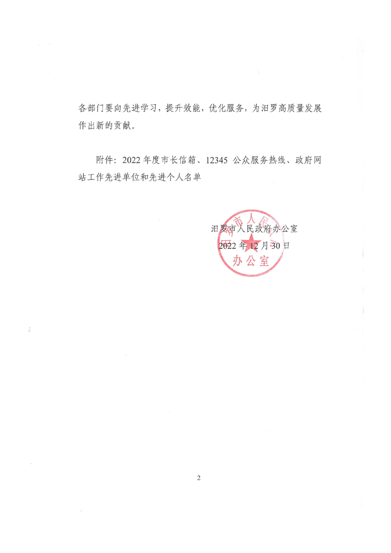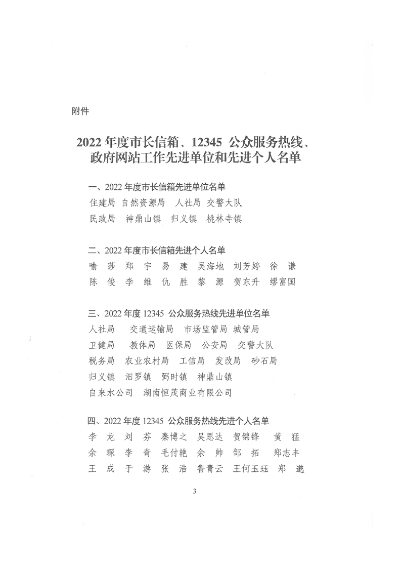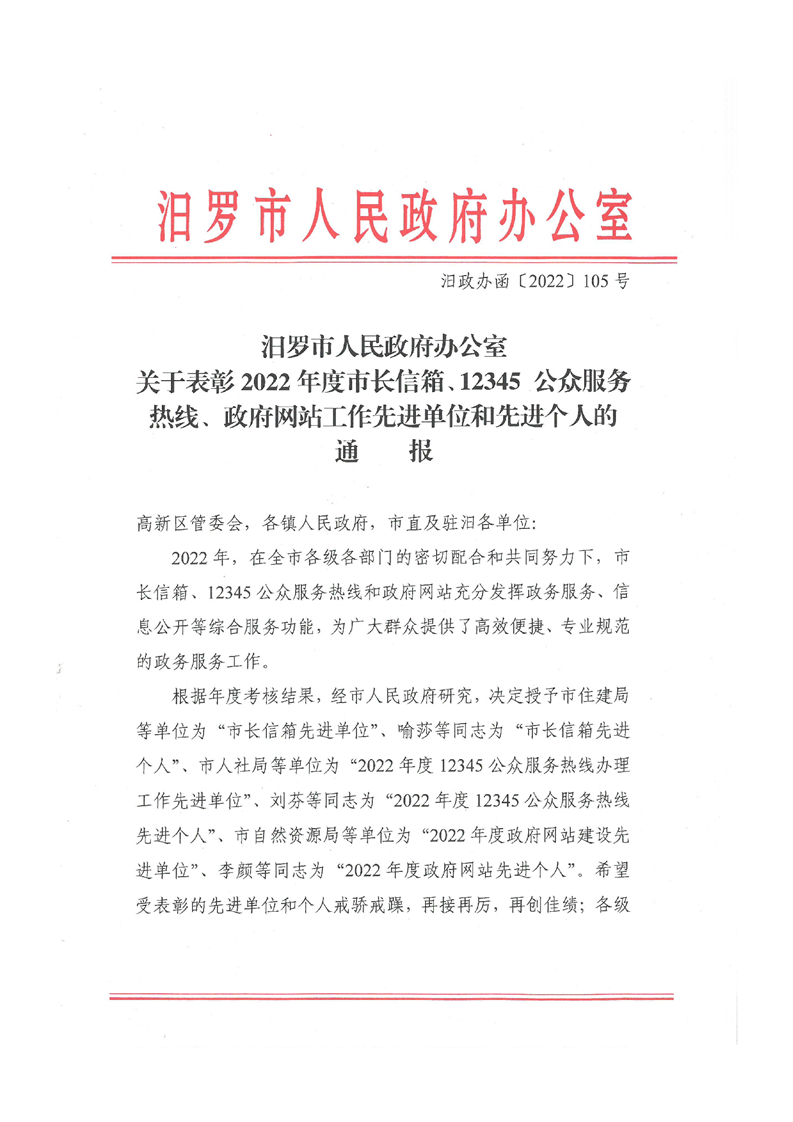 关于表彰2022年度市长信箱、12345公众服务热线、政府网站工作先进单位和先进个人的通报