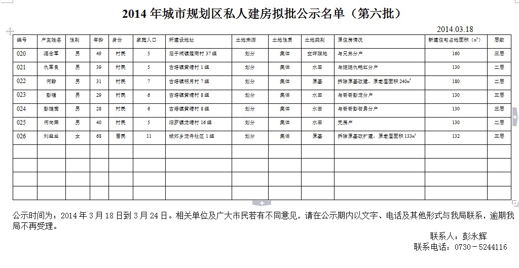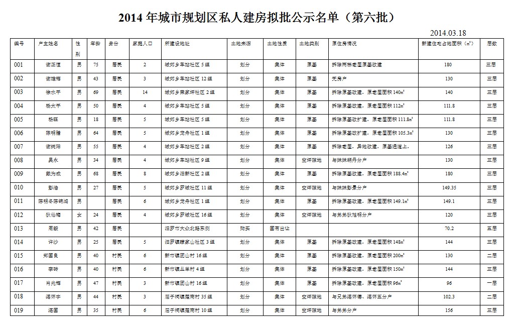 2014年城市规划区私人建房拟批公示名单(第六批)