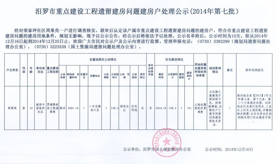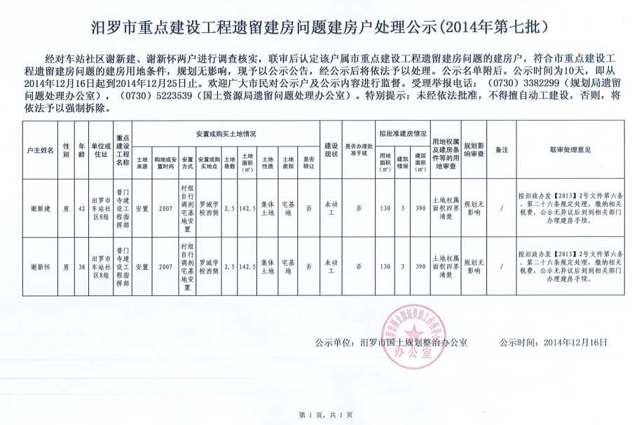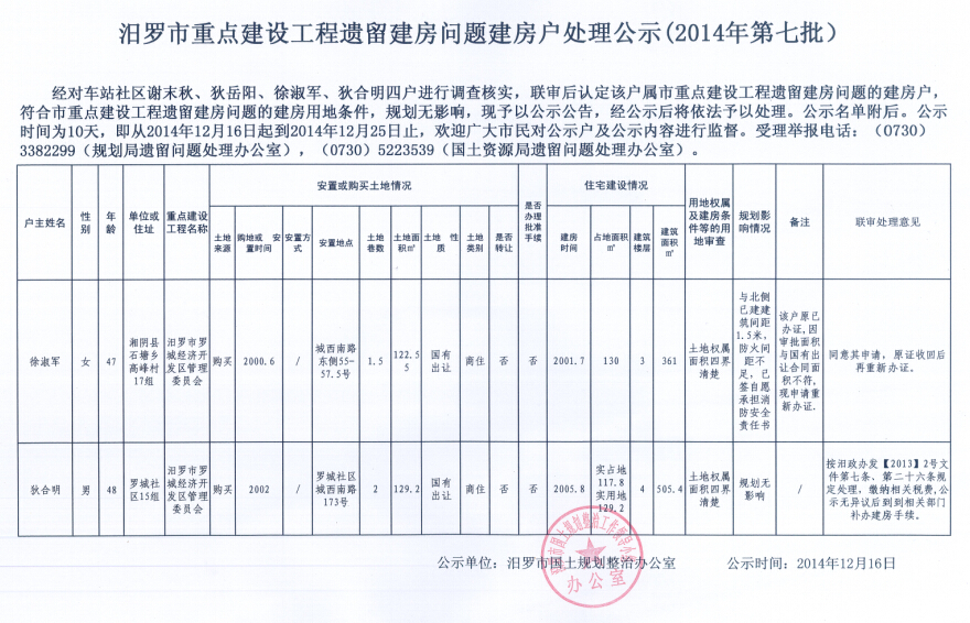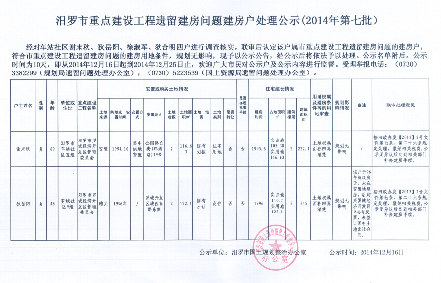 汨罗市重点建设工程遗留建房问题建房户处理公示{2014第七批}