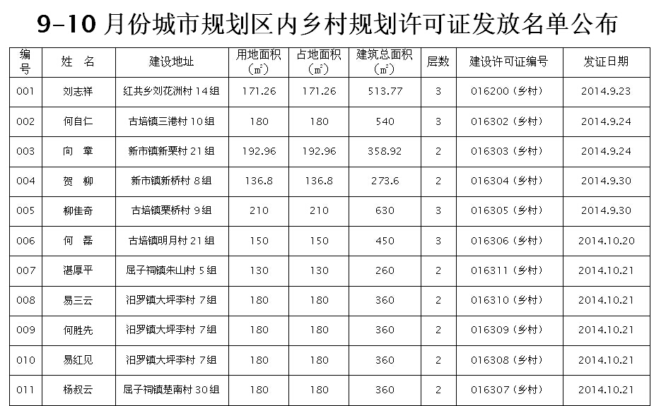 9-10月份城市规划区内乡村规划许可证发放名单公布