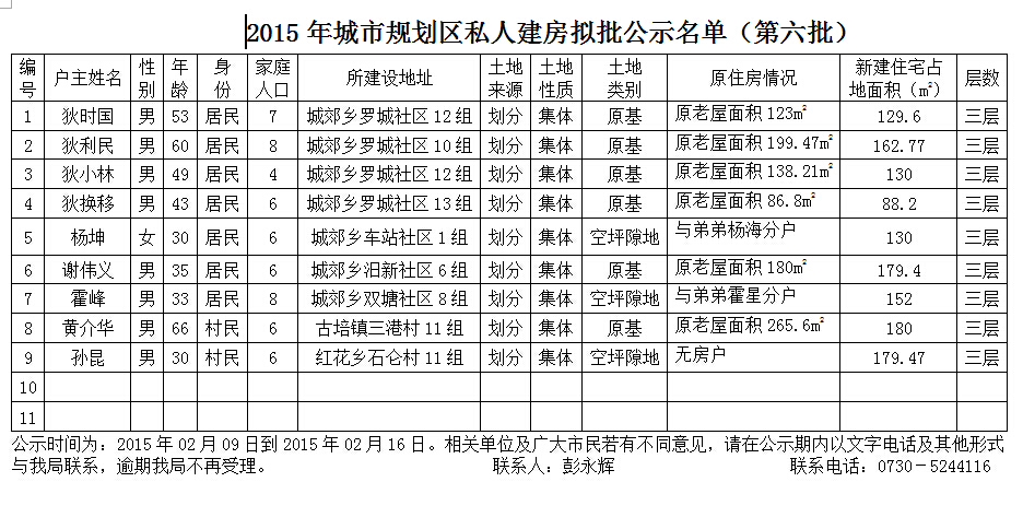 2015年城市规划区私人建房拟批公示名单(第六批)