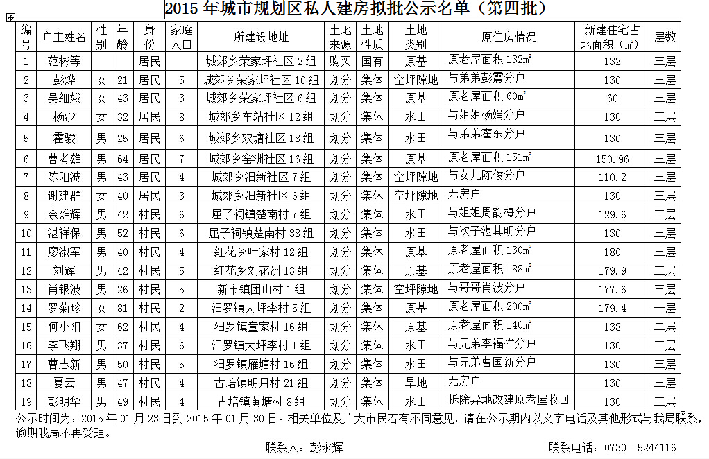 2015年城市规划区私人建房拟批公示名单(第四批)