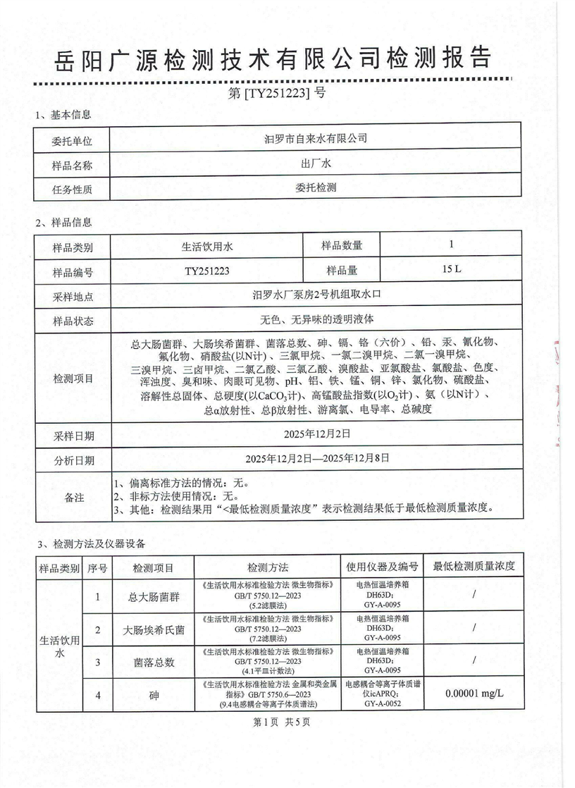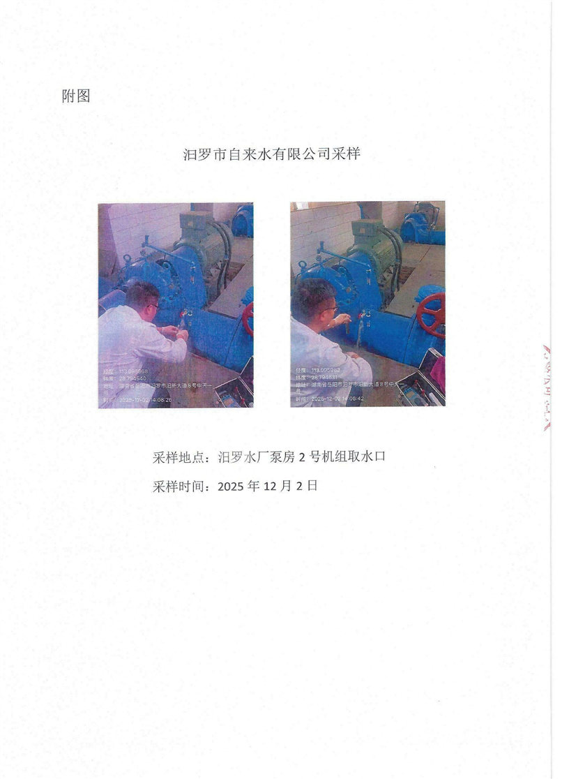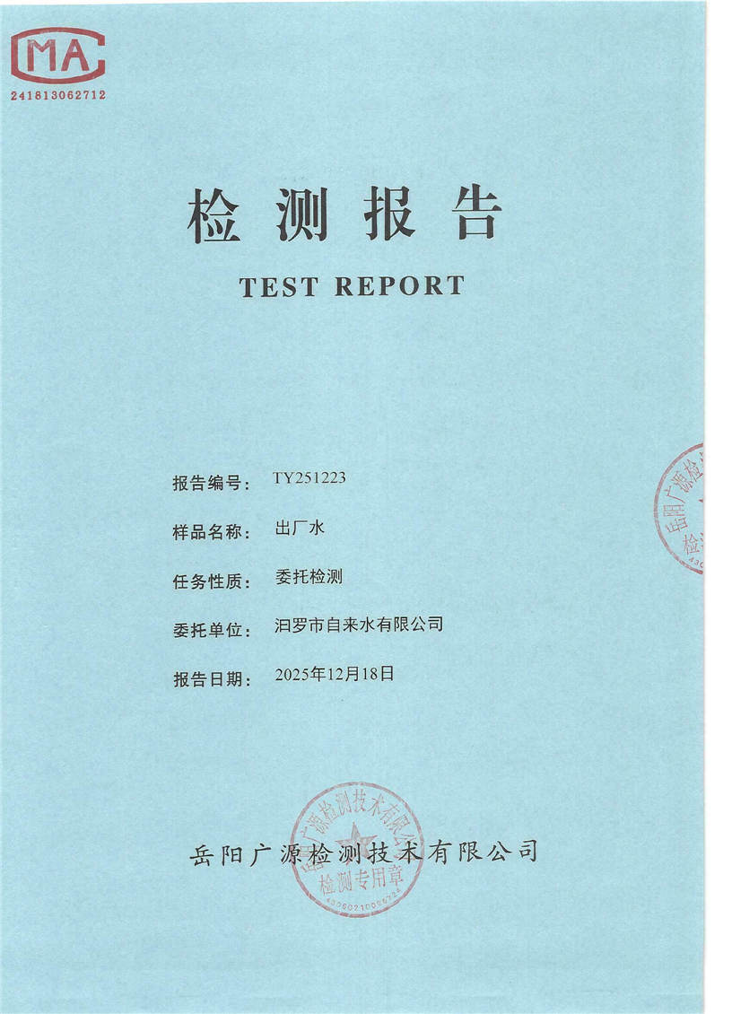 2026年1月份汨罗市自来水有限公司出厂水水质检月报表