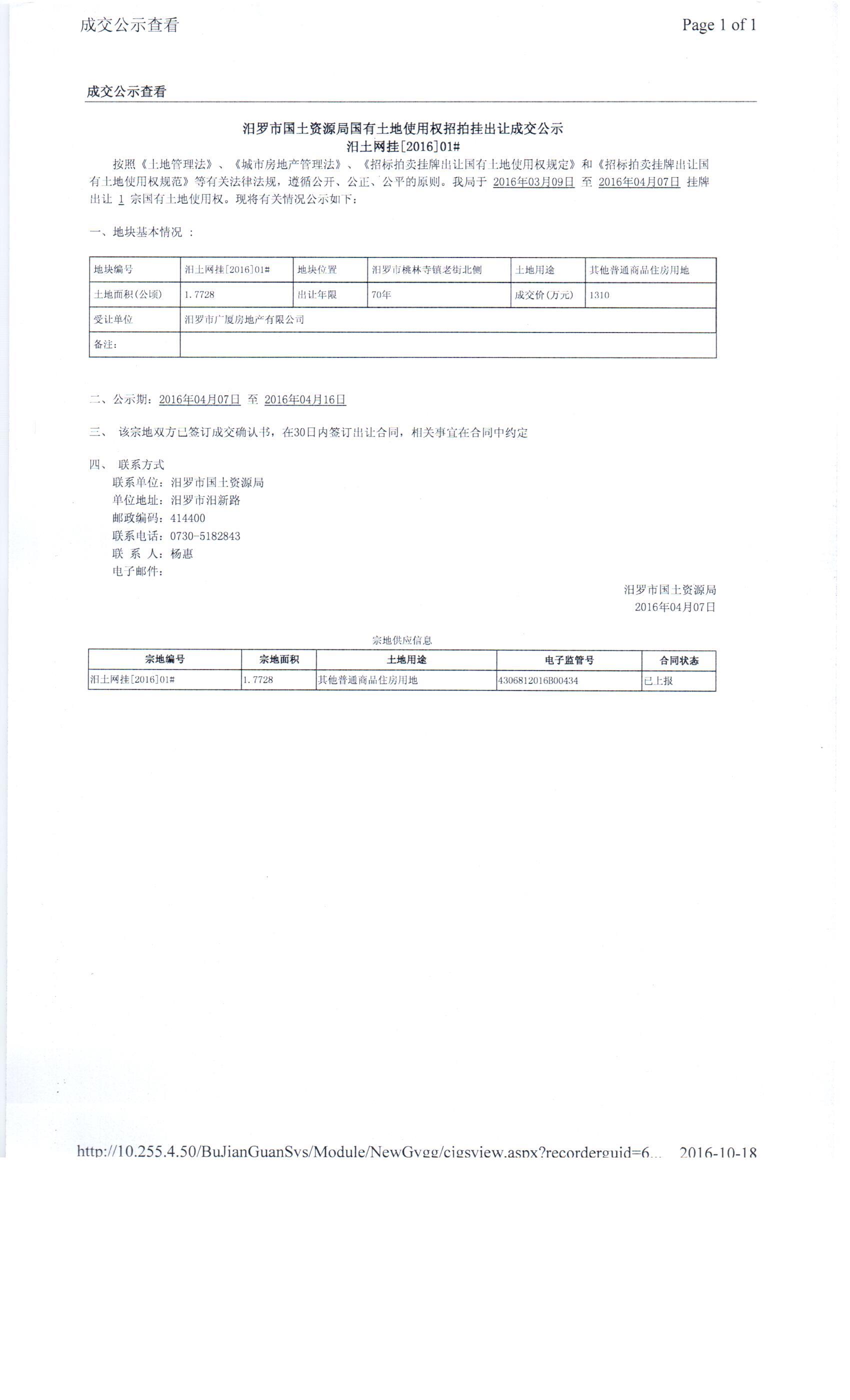 汨罗市国土资源局国有土地使用权招拍挂出让成交公示汨土网挂【2016】01#
