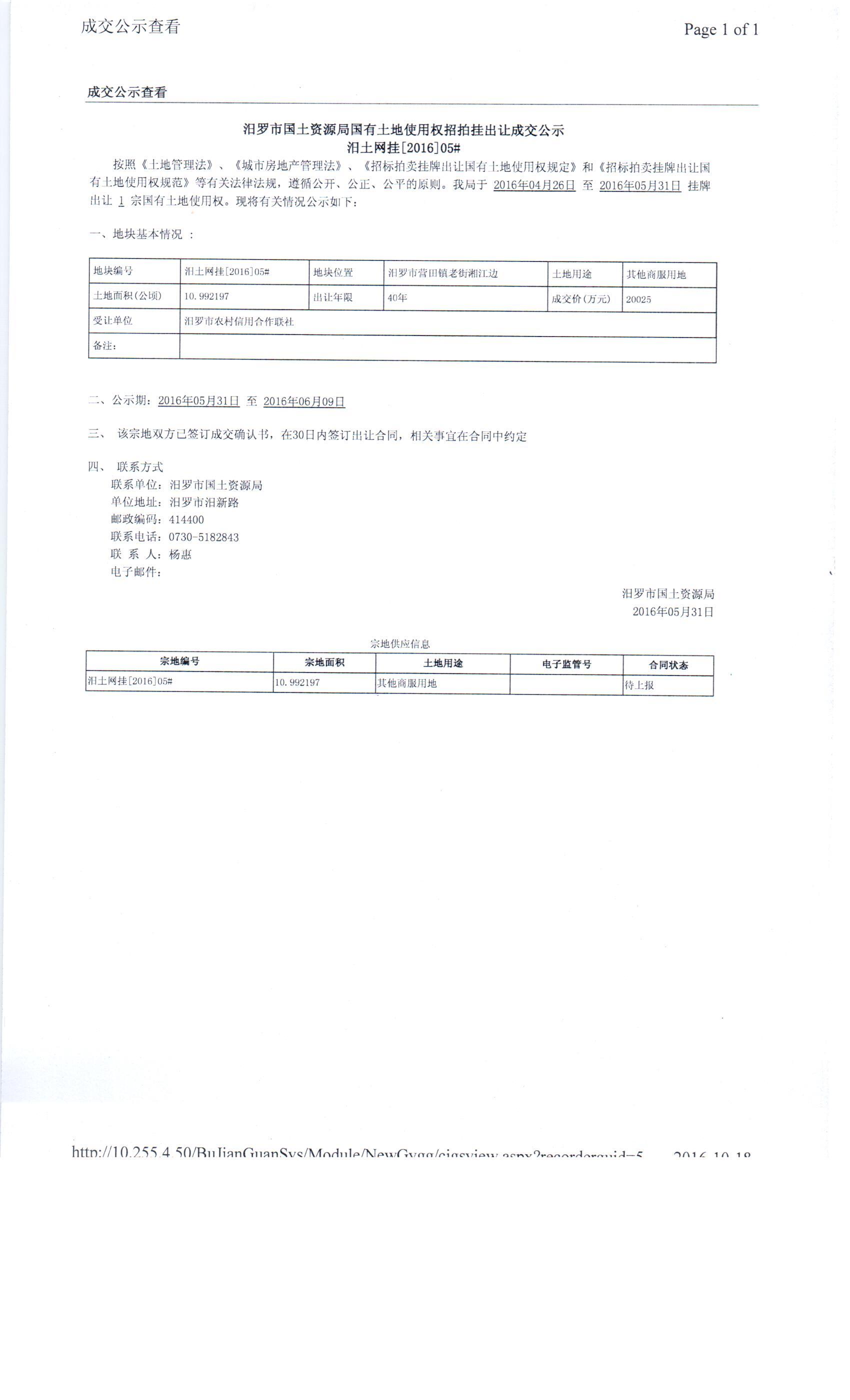 汨罗市国土资源局国有土地使用权招拍挂出让成交公示汨土网挂【2016】05#