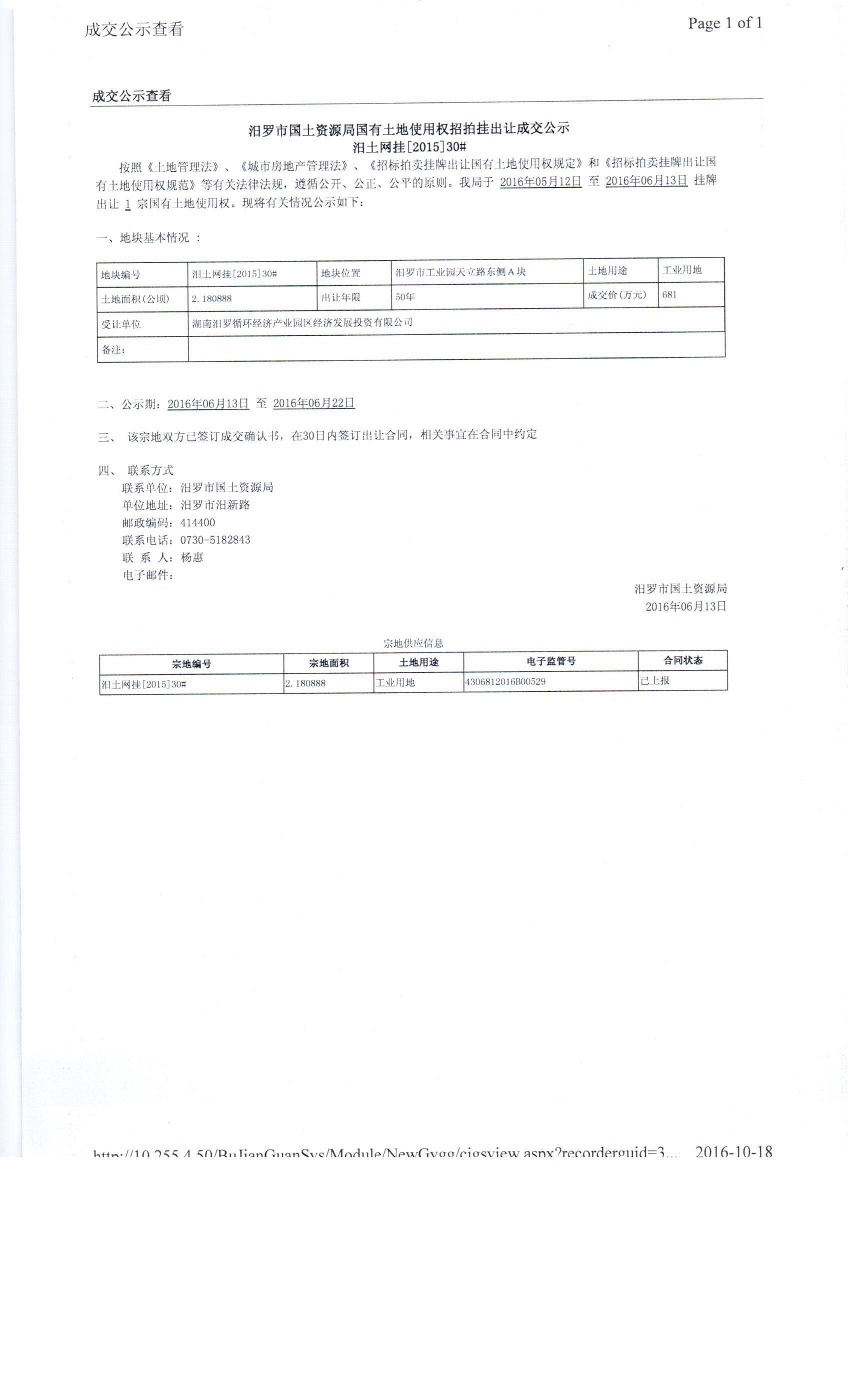 汨罗市国土资源局国有土地使用权招拍挂出让成交公示汨土网挂【2015】30#