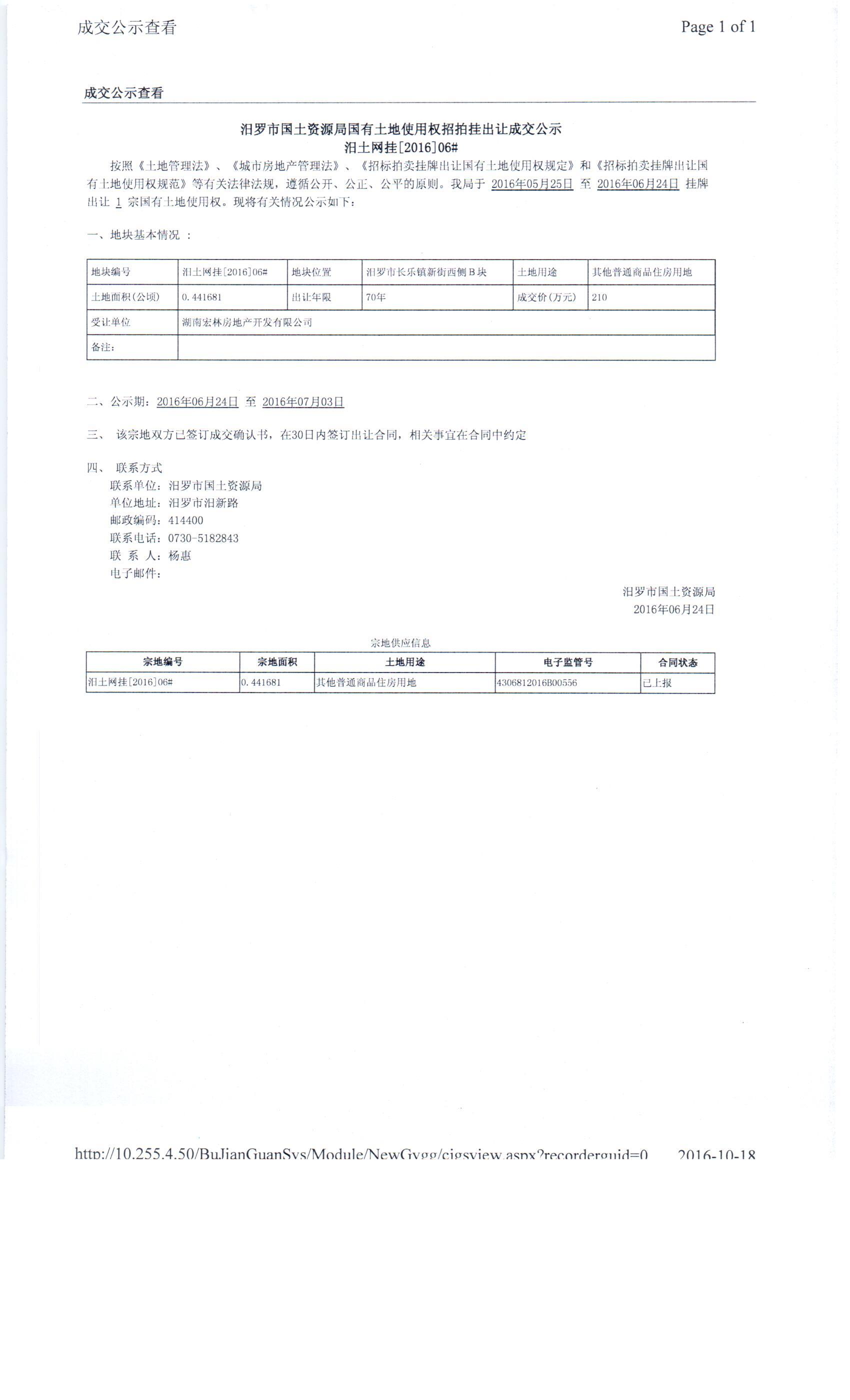 汨罗市国土资源局国有土地使用权招拍挂出让成交公示汨土网挂【2016】06#