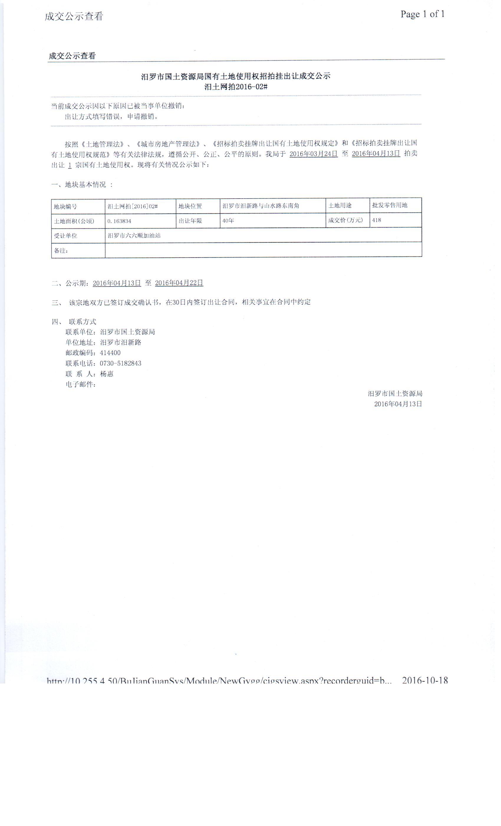 汨罗市国土资源局国有土地使用权招拍挂出让成交公示汨土网拍【2016】02#