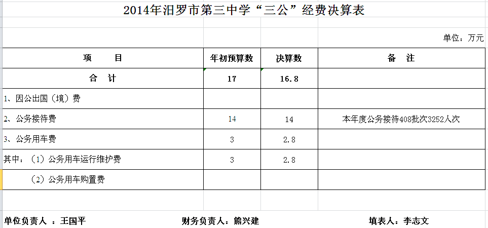 2014年汨罗市第三中学部门单位决算和“三公”经费决算公开表