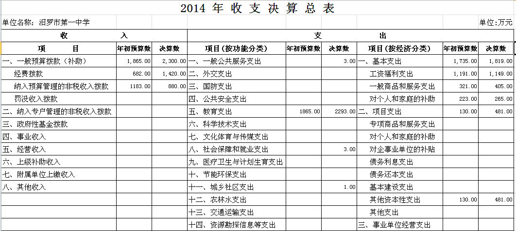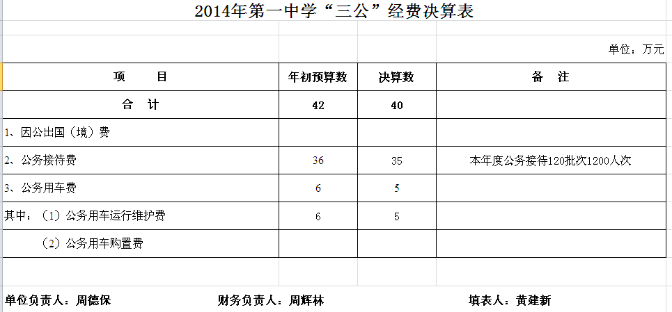 2014年汨罗市第一中学部门单位决算和“三公”经费决算公开表