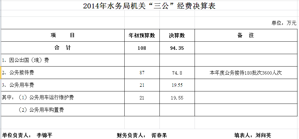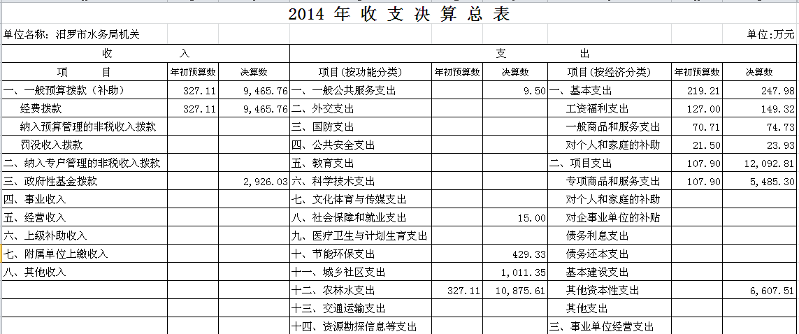 2014年汨罗市水务局机关收支决算总表及“三公”经费决算表