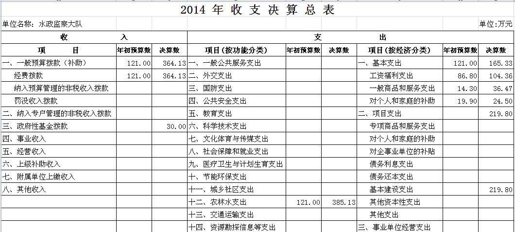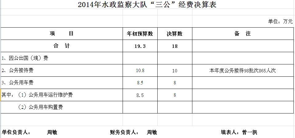2014年水政监察大队收支决算总表及“三公”经费决算表